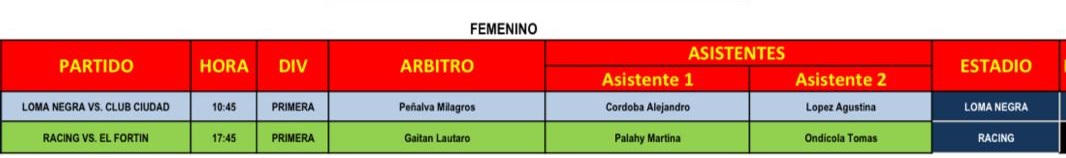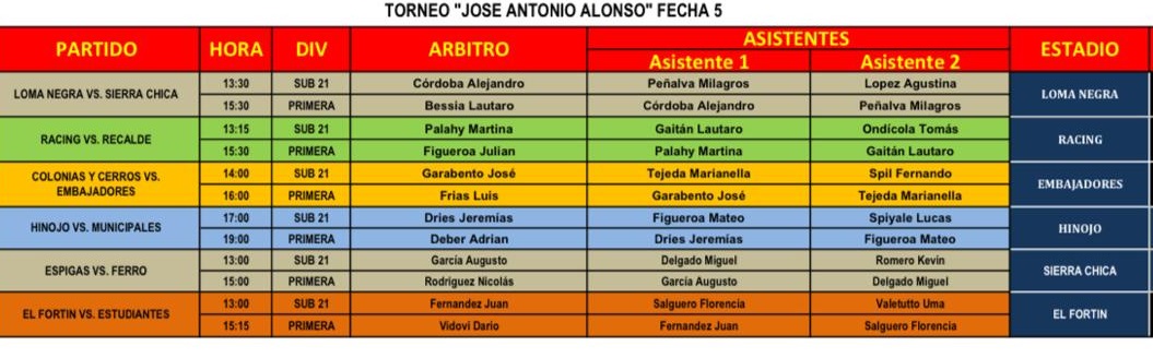 Fútbol Domingo de Primera a puro fútbol por el Torneo Anual y el Femenino Por Emblema Deportivo - 30 de agosto de 2025 0 224 FacebookXPinterestWhatsApp Cronograma de la actividad con horarios, árbitros y escenarios. Foto: Primera División del Club Loma Negra. 5ta. FECHA DEL TORNEO ANUAL » JOSÉ ANTONIO ALONSO» DOMINGO 31 //////// FÚTBOL FEMENINO DE PRIMERA ( cliquear para agrandar la imágenes )