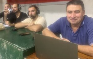El streaming con la dirección de Fede Salomón. Relatos de Gabo Foti, comentarios de Tomás Cachero. En primer plano Cristian Sáncuez, junto a Pablo Berrueta los «alma mater» del Comercial de básquetbol.