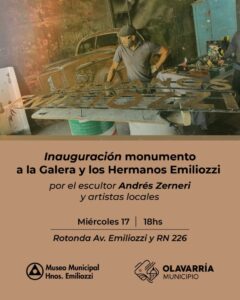 El Municipio de Olavarría invita a la comunidad a participar de la inauguración oficial del monumento a los Hermanos Emiliozzi, actividad que se llevará a cabo este miércoles desde las 18 horas, frente al puente que lleva el nombre de los “gringos”, sobre avenida Pringles, a la altura del cruce con la Ruta Nacional N° 226. Se trata de una iniciativa que fue encabezada desde el área de Patrimonio Cultural, en articulación con distintas áreas municipales.