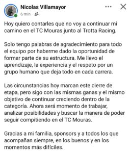 Nicolás Villamayor publicó en sus redes su salida del Trotta Racing dentro del TC Mouras.