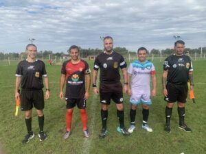 Marcos Palavecino, juez del encuentro, sus colaboradores y los capitanes.