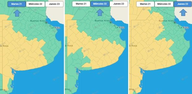 El área será afectada por tormentas, algunas localmente fuertes. Se espera que las mismas puedan estar acompañadas por abundante caída de agua en cortos períodos, frecuente actividad eléctrica, granizo y ráfagas intensas que podrían alcanzar los 90 km/h. Se prevén valores de precipitación acumulada entre 30 y 70 mm, que pueden ser superados de manera puntual. Las mayores precipitaciones se esperan entre la tarde del jueves 23 y el viernes 24.