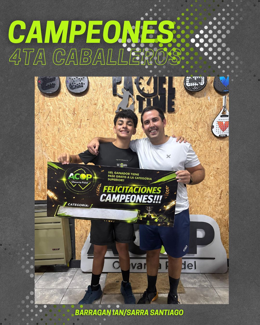 En Caballeros Cuarta, el título quedó en manos de la dupla integrada por Santiago —junto a Ian Barragán—, quienes se impusieron en la definición ante Lautaro Digiacomo y Coria por 6/4 y 7/6. El MVP fue para el joven Barragán, de tan solo 14 años.