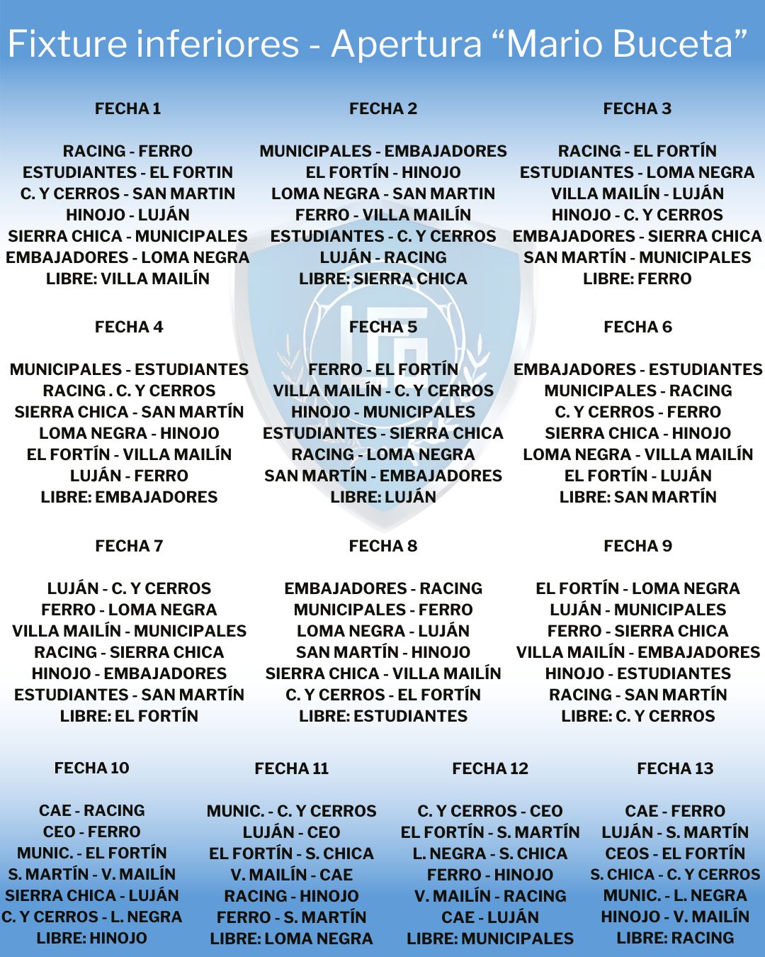 El torneo Apertura de divisiones inferiores “Mario Buceta” ya tiene su fixture, de cara al inicio de la competencia que comenzará el próximo sábado.
