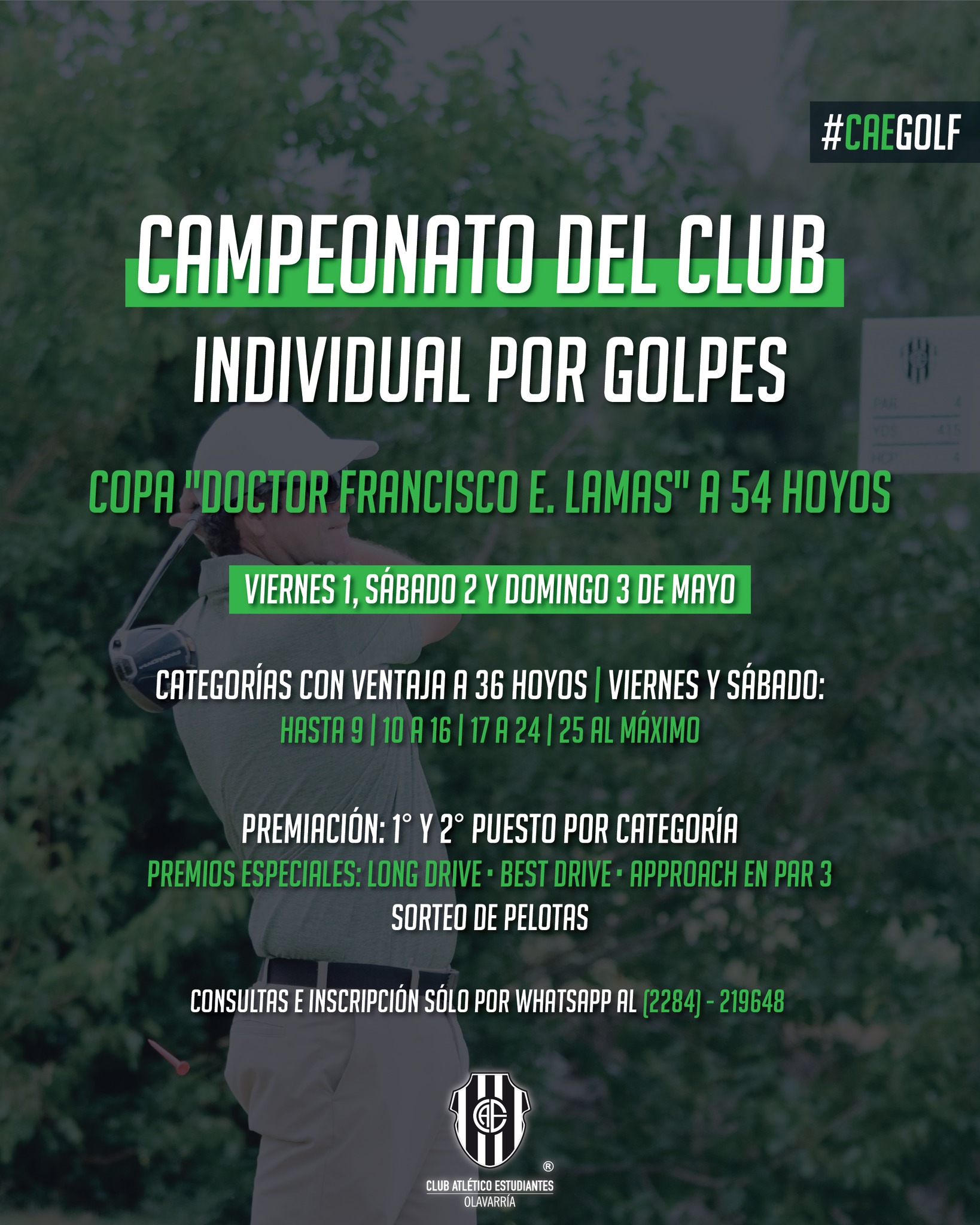 La actividad, a 54 hoyos, se desarrollará los días viernes 1, sábado 2 y domingo 3 de mayo, con categorías con ventaja a 36 hoyos durante las dos primeras jornadas y abarcará hasta 9 | 10 a 16 | 17 a 24 | 25 al máximo, además de premiación al 1° y 2° puesto por categoría.